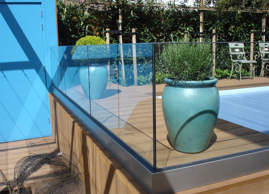 Eine Vollglasbrüstung ist in einem Bodenprofil befestigt und vermittelt einen räumlichen Eindruck.