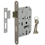 Dieses Schrankschloss ist mit einer Schlüssellochgröße von 56 mm abschließbar und wird mit 2 Tastaturschlüsseln geliefert. Die Schlösser und passenden Schließbleche von Intersteel sind in verschiedenen Ausführungen und Drehrichtungen erhältlich. 50 mm beträgt die Dorngröße des Schlosses, das inklusive Schließblech und Stulp geliefert wird. Die Stulpschiene aus gebürstetem Edelstahl hat eine Abmessung von 174 x 20 mm (HxB). Sie können die gleichen Beschlags- und Fräsmaße wie bei einem Standard-Wohnungsschloss verwenden.